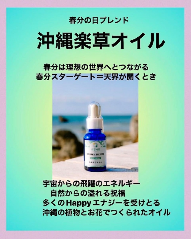 春分の日ブレンド 沖縄楽草オイル (30ml) ♡ソマチッドパウダー配合 春分の日は宇宙元旦。 春分は 理想の世界へとつながる 春分スターゲート=天界の扉が開くとき 宇宙からの飛躍のエネルギー 自然からの溢れる祝福 たくさんのHappyエナジーを受け取る特別な楽草オイルです。 2026年の春分のサインを大切に ・沖縄三大薬草・ヘゴ・ウコン・イシャナカセソウ・竜眼・琉球シナモン ・ヒスイカズラ・サクラ・バラ・オオゴチョウ・月下美人など 38種類の沖縄の植物とお花の沖縄楽草オイルを選んで優しくブレンドしました。 沖縄県産タマヌオイル・タイガーナッツオイル・モリンガオイル ・アルガンオイル・ハトムギオイルなど8種類の天然由来のランクAのオイルを使用しています。 香りは、シークワーサー・月桃・琉球マツ・など沖縄楽草のエナジーがいっぱいの癒される優しい香りです。 さらに味わい深くて人間味のある より魅力的な人間になっていくことを 応援する沖縄楽草オイルです。 美しい人=健康な人 ♡ 心もカラダもお肌も喜ぶブレンドです あなたの夢の実現のためにワクワクと 楽しく使える沖縄楽草アイテムです。 沖縄の植物とお花との真の交流。 もっと楽しく、楽になる沖縄の植物とお花を身に纏う心豊かな楽草時間をお楽しみくださいませ。 ♡幸せのスタートは いつでもまずは自分から。。。 もっと楽しく、楽になる 沖縄の植物とお花を身に纏う 心豊かな楽草時間をお楽しみくださいませ。 【嬉しいプレゼント】 ※1万円(税込)以上お買い上げで 月桃楽草水(30ml)スプレーを特別プレゼント。 あなた様の毎日を更にハッピーに彩ります♪ 農薬や化学肥料不使用で 人間の体液と同じphの湧き水で育った貴重な月桃を メドベッドを超えたともいわれる メドマシンで作られた超高濃度素粒子水で蒸留しました。 ☆完全無添加の蒸留楽草水です 到着後はお早めにお使い下さい。 どうぞ楽しみにお使い下さいませ♪