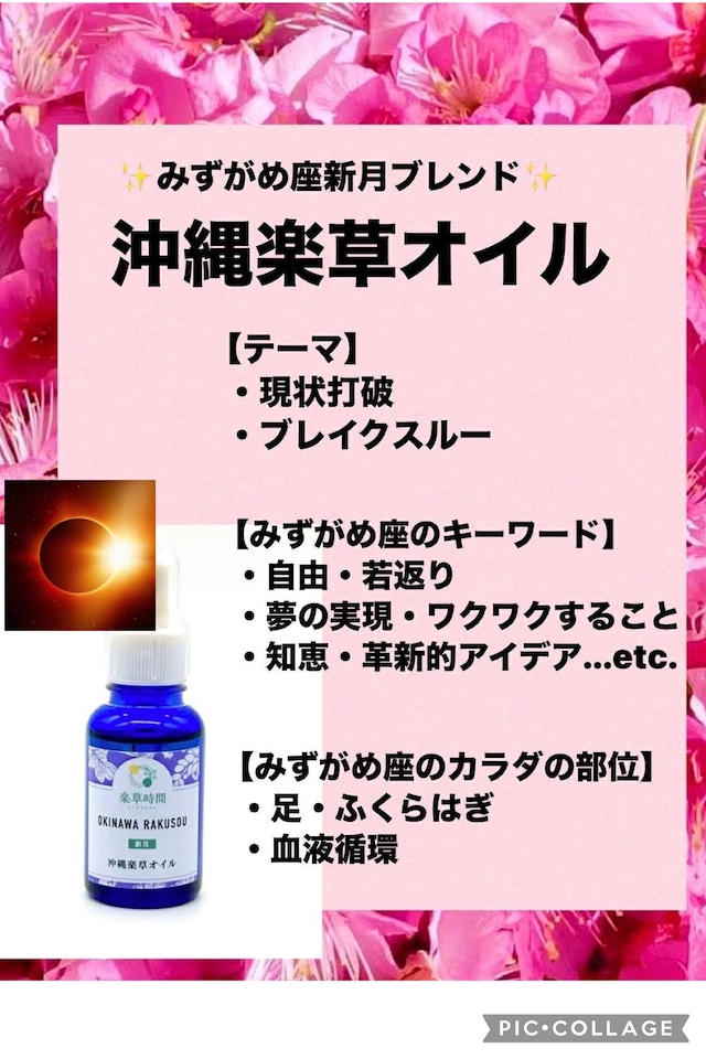 水瓶座新月 みずがめ座新月(旧正月)&金環日食 ブレンドの沖縄楽草オイル(30ml) ♡ソマチッドパウダー配合 静かに運命が書き変わる特別な夜 静かに運命が動き出すオイルが誕生。 革命の星・天王星をルーラー(支配星)に持つ、「現状打破」「ブレイクスルー」がテーマのサインです。 水瓶座のエネルギーは、博愛。 自分だけでなく、世の中全体のためになることへと 目を向かせてくれます。 独占欲やジェラシーで波立つ心を沈める力も与えてくれるでしょう。 みずがめ座の特徴 *仕事、人間関係、恋愛など、 日常生活やあなた自身に新しい風を吹き込む *長い間苦しんでいる悩みを一気に解決する、 新しい発想や動きをもたらす 今回の水瓶座新月のサインは 足元から人生向上。 ☆「本来の力」を引き出す。 ☆「ブレない軸」をつくる。 ☆「大地のエネルギー」と繋がる。 ☆足元を整えて 「今、ここの好機」に動き出す。 【みずがめ座のキーワード】 ・発明・革新的アイデア・自由・若返り ・知恵・ユーモア・夢の実現 ・ワクワクすること … etc. 【身体の部位】 ・足・ふくらはぎ・血液循環 みずがめ座のサインを大切に38種類の沖縄の植物とお花のオイルを選んで優しくブレンドしました 農薬や化学肥料不使用の沖縄三大薬草・琉球マツ・足に良い薬草・血流を良くして、カラダを温める薬草・世界一の薬効成分の薬草、パワフルエナジーの沖縄のお花たち(島サクラ・島バラ・サガリバナ・ヒスイカズラ・琉球姫菊・多種類の蘭・カトレア...etc.) 今回も沢山の沖縄の植物とお花をお楽しみ下さいませ。 沖縄県産のランクAのオイルと天然由来の8種類の豊かなオイルを使用。 心もカラダもしっかりバランスをとっていける沖縄の植物とお花のエナジーが溢れ 癒される自然の中で暮らしている様な香りもお楽しみ下さい。 今回は自然栽培のシークワーサーと月桃の香り。 さらに味わい深くて人間味のある より魅力的な人間になっていくことを 応援するオイルです。 沖縄のパワーにあふれたこのブレンドは、 あなたの心を豊かにし、感情の安定を促します。 心地よい香りがふんわりと広がり、 リラックス効果を感じるこの沖縄楽草オイルは、 あなたの日常に大きな彩りを与えます。 心を落ち着け、 幸福感を引き出す手助けをする印象深いアイテムです。 沖縄の植物とお花との真の交流。 もっと楽しく、楽になる 沖縄の植物とお花を身に纏う 心豊かな楽草時間をお楽しみくださいませ。 ♡幸せのスタートは いつでもまずは自分から。。。 【嬉しいプレゼント】 ※1万円(税込)以上お買い上げで 琉球ヨモギ楽草水(30ml)スプレーを特別プレゼント。 あなた様の毎日を更にハッピーに彩ります♪ 農薬や化学肥料不使用で 人間の体液と同じphの湧き水で育った貴重な琉球ヨモギを メドベッドを超えたともいわれる メドマシンで作られた超高濃度素粒子水で蒸留しました。 琉球ヨモギ ・沖縄重要薬草 ・沖縄三大薬草 ☆完全無添加の蒸留楽草水です 到着後はお早めにお使い下さい。 どうぞ楽しみにお使い下さいませ♪